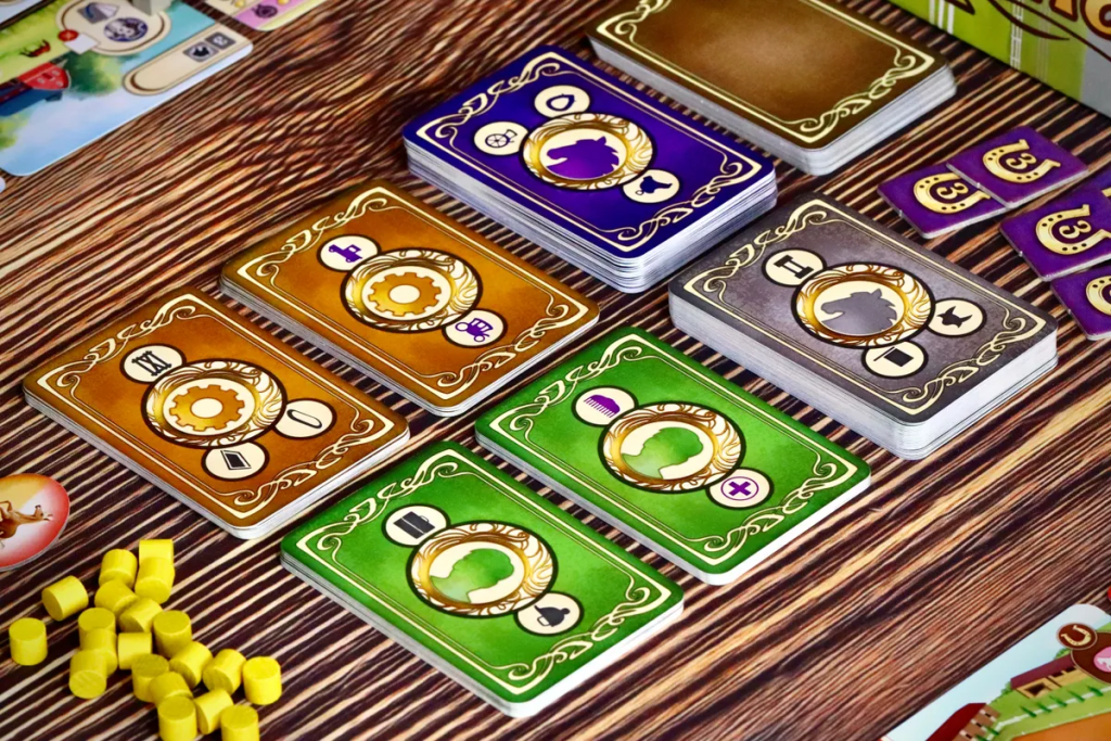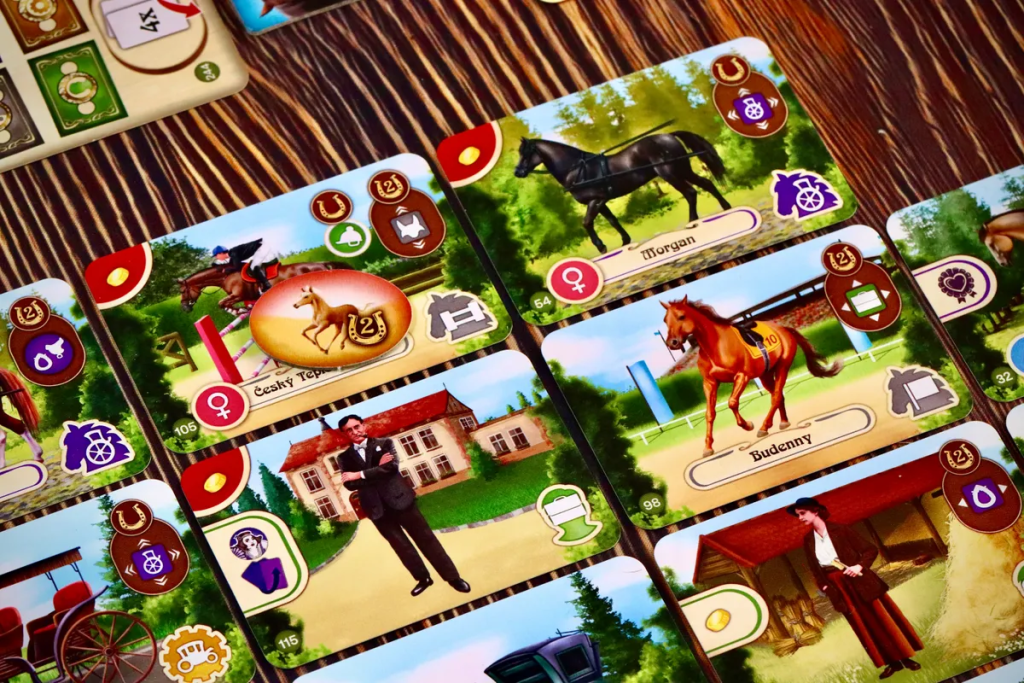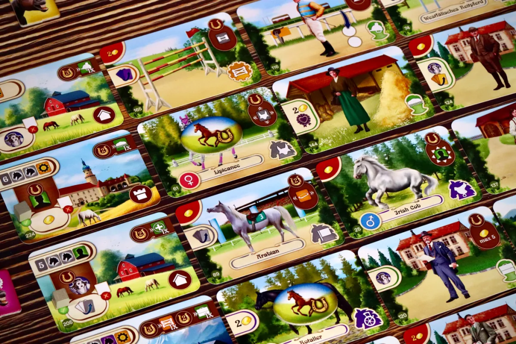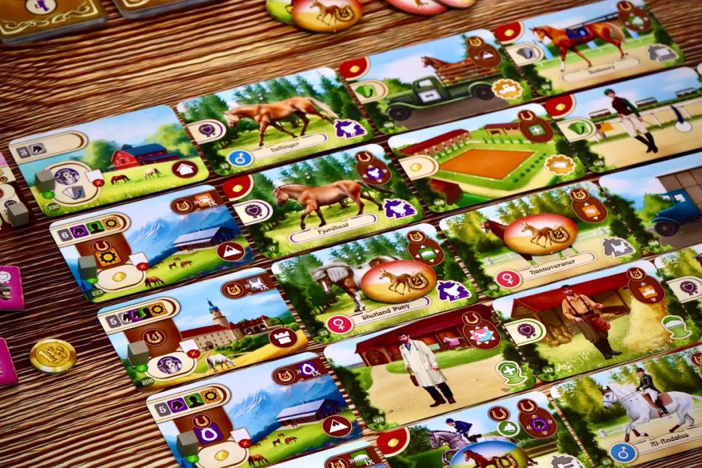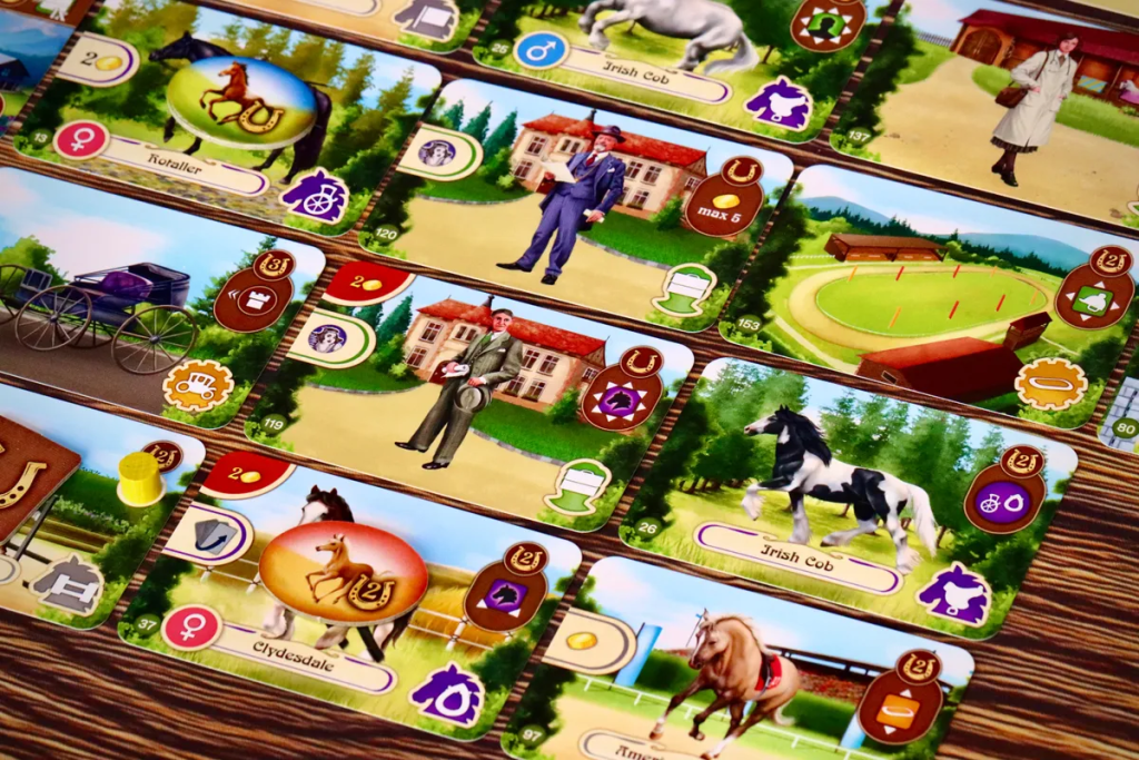 Epona. Евро от Владимира Сухи про лошадиный бизнес — разведение лошадей, скачки и ставки. В механиках это табло-билдер с картами и выкладыванием их особенным образом на игровом поле.