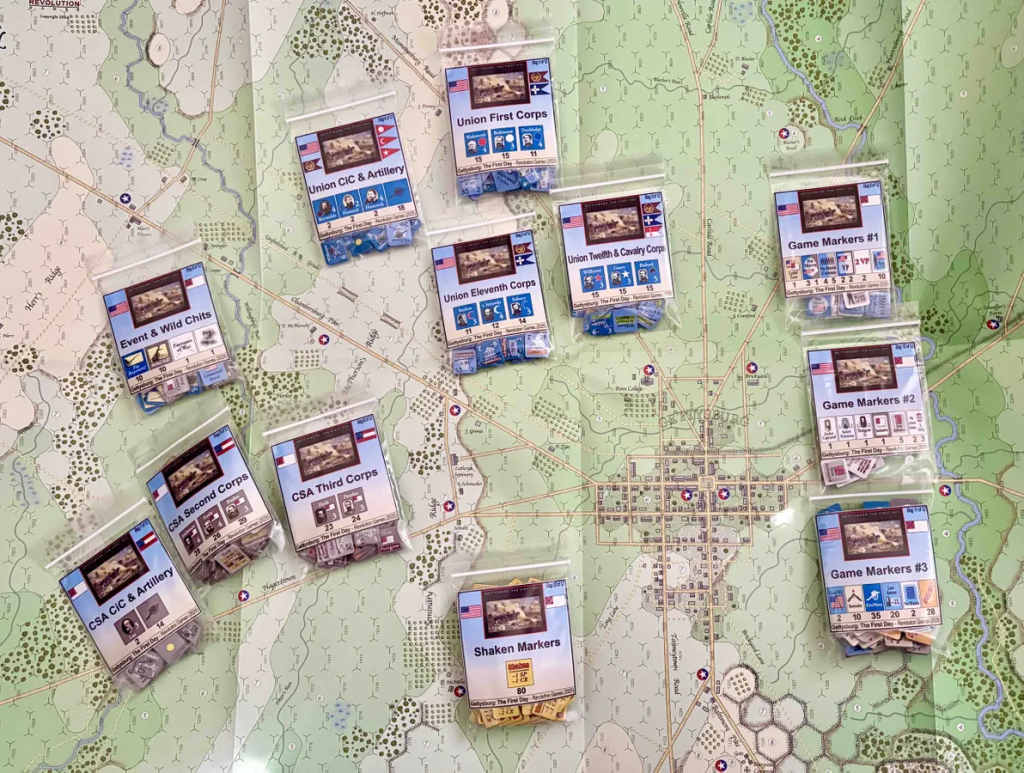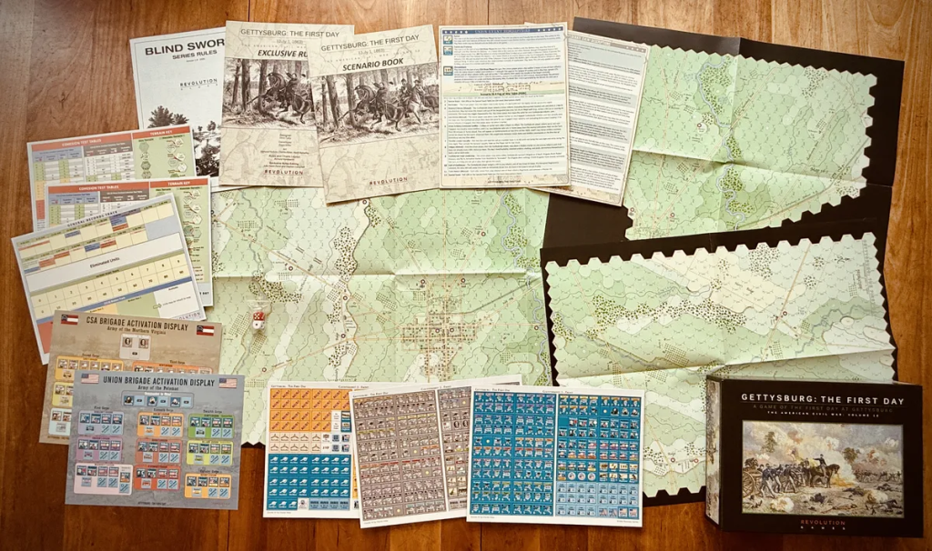 В коробку положат три двусторонних поля, пятнадцать тайлов, больше сотни карт, жетоны, кубики и отдельные книжки под правила, сценарии и кампанию. Играть можно как в ветвящиеся четырёхсценарные арки в духе компактного Stalingrad, так и в любой из пятнадцати одиночных сценариев, если хочется просто поставить на стол мехов и истребители на вечер.